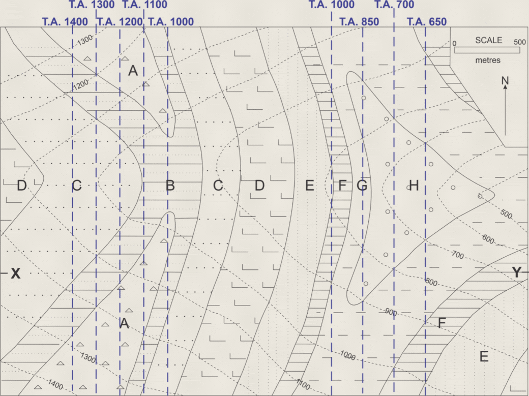 Em ambos os casos, o primeiro passo é identificar as LS que correspondem ao plano axial (por exemplo, T.A. 1000). Depois, usamos essas linhas para projetar o traço axial no mapa, da mesma forma como traçamos contatos geológicos.