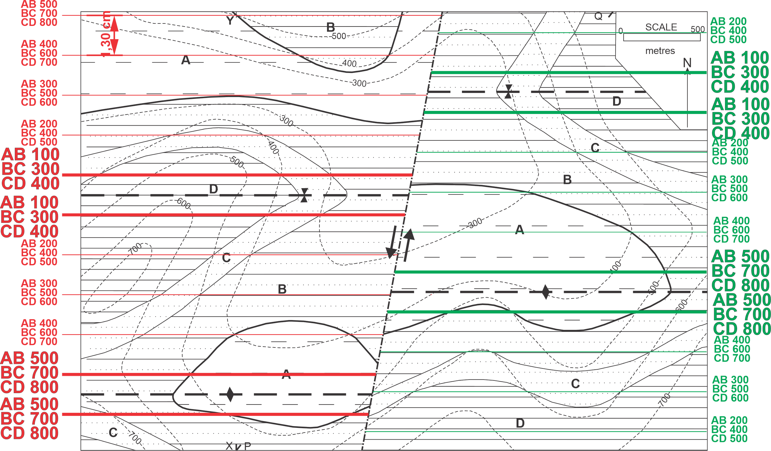 AB 200 se sobrepõe a AB 154, logo o deslocamento vertical da falha foi de 46 m (= 200 - 154).
