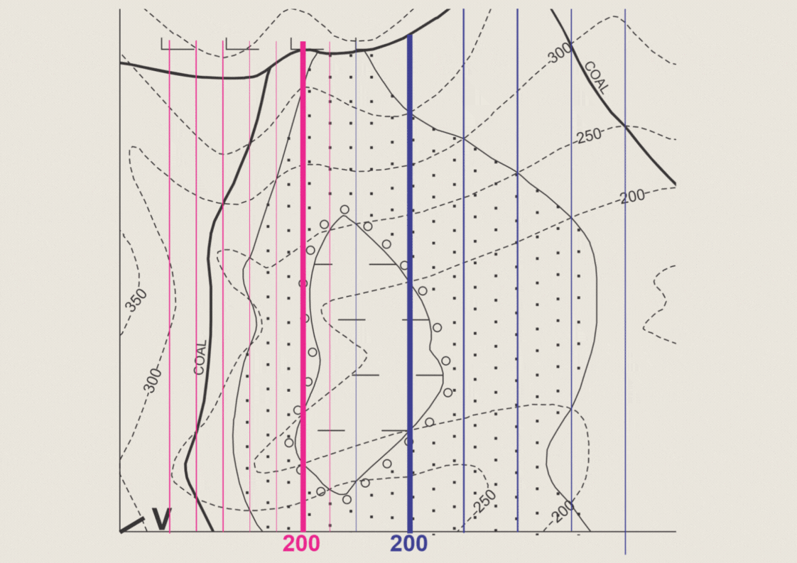 A sul da discordância: camadas dobradas, com flancos mergulhando para direções opostas, mas com ângulos diferentes. O flanco com mergulho para oeste tem ângulo de mergulho maior que o flanco que mergulha para leste.