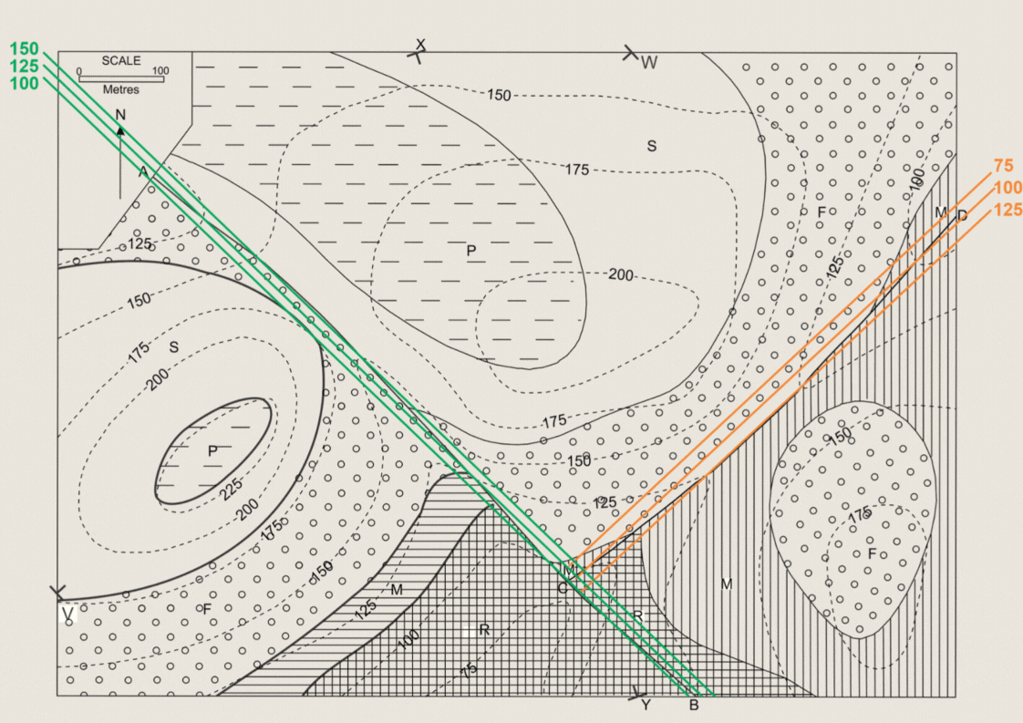 3. Construa as seções X-Y e V-W.