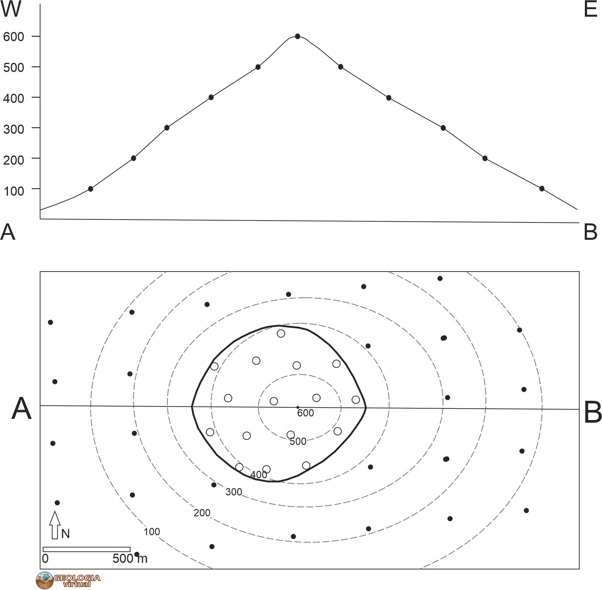 Figura 5: Esquema do mapa geológico e seção topográfica mostrando as elevações ao longo da linha de corte A-B, que é transversal ao mapa.