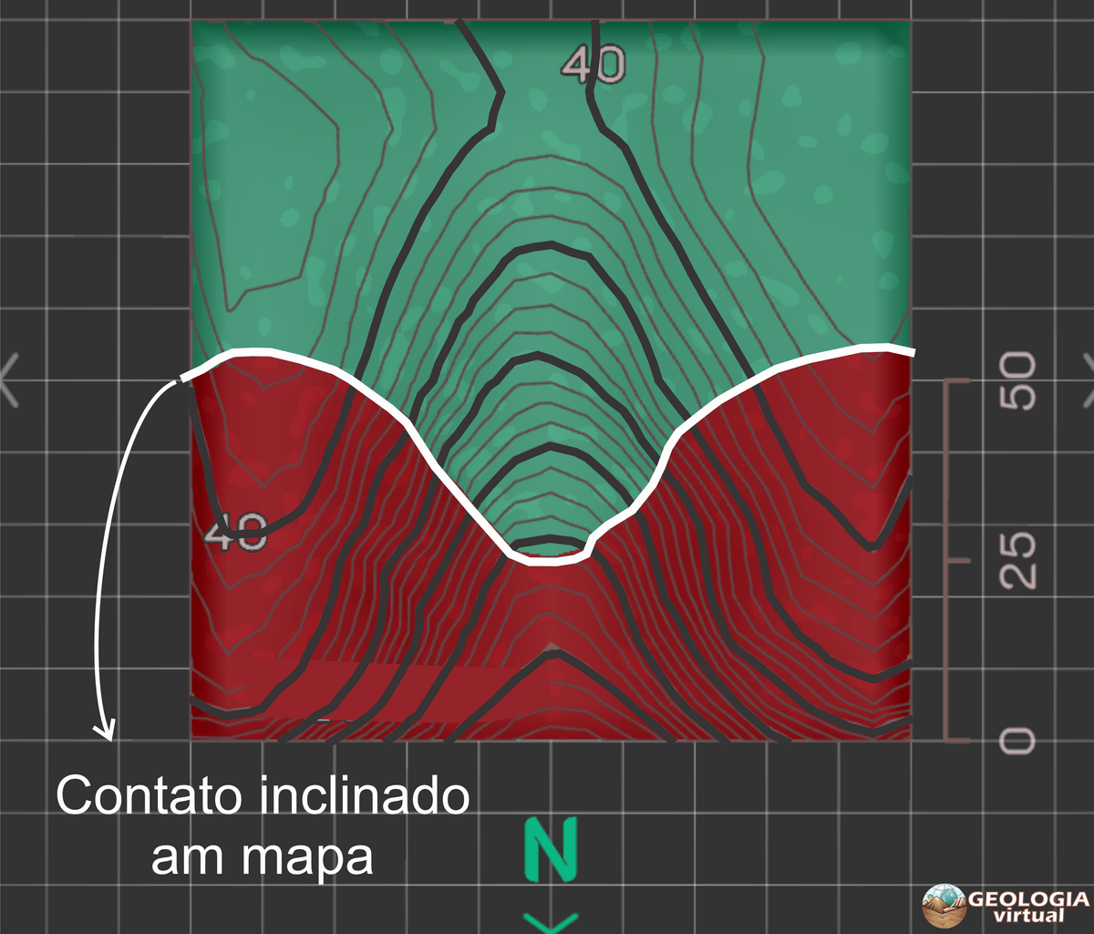 Animação 2: Construção das LS em mapa, mostrando a direção de mergulho das camadas. As cotas das LS diminuem em direção ao Norte, indicando a direção do mergulho.