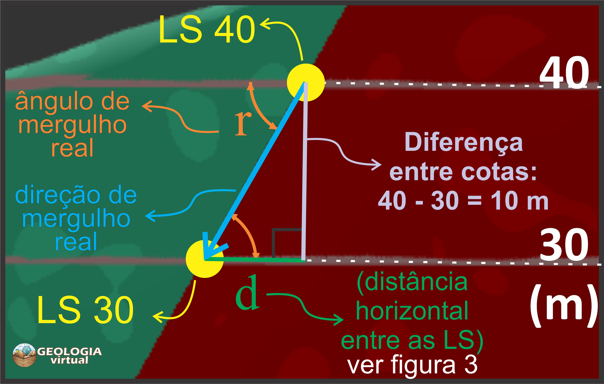 Figura 2: Para calcular o ângulo de mergulho real (r), é necessário definir a diferença de cotas entre duas LS escolhidas (LS 40 e LS 30, que é de 10 metros) e a distância horizontal (d) entre essas LS no mapa (veja o cálculo na Figura 3).