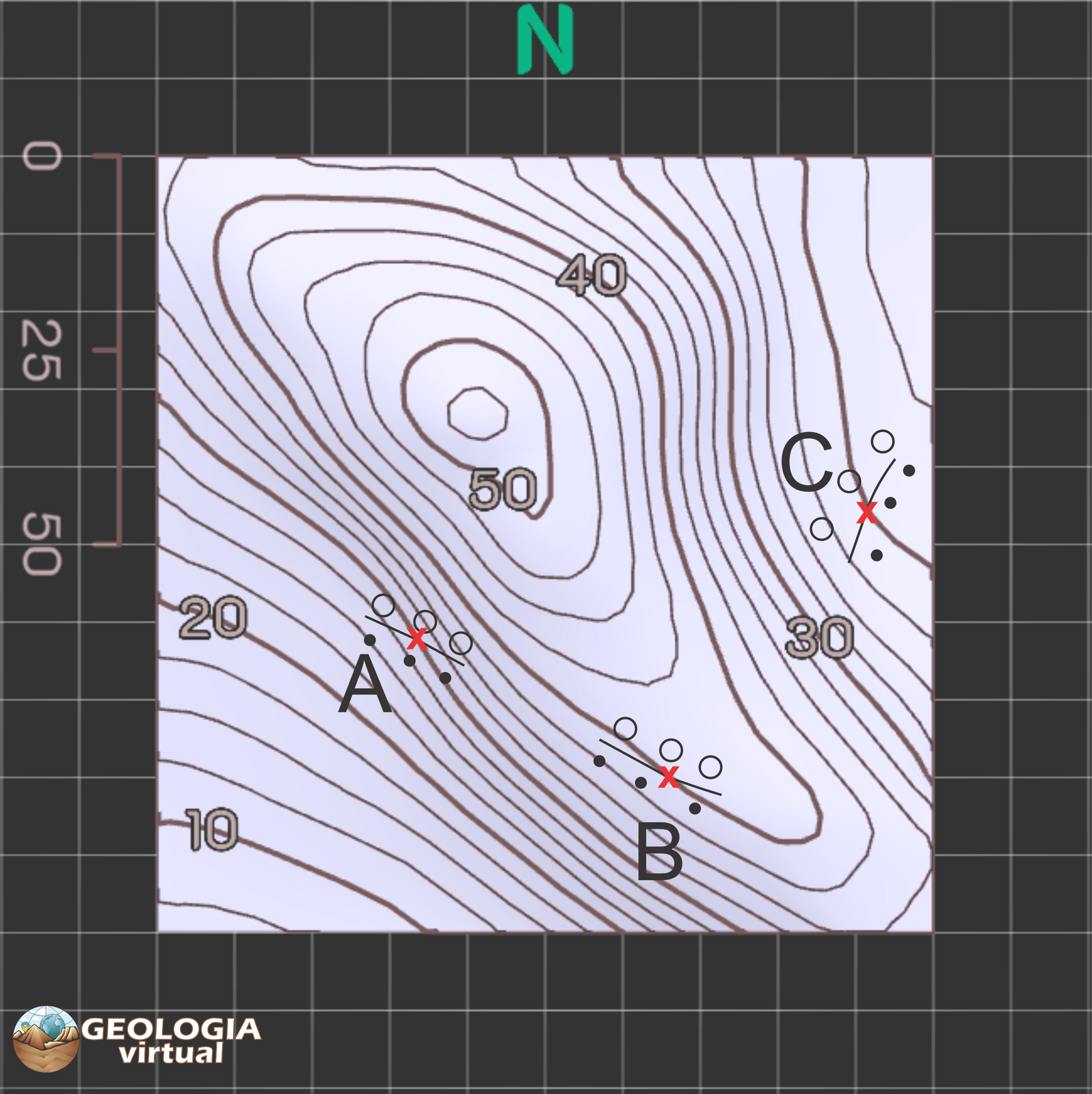 Imagine que você verificou no mapa um contato entre um arenito e um conglomerado aparecendo em três lugares diferentes (A, B e C) em um terreno, como na figura 1. Cada ponto está a uma altitude diferente: