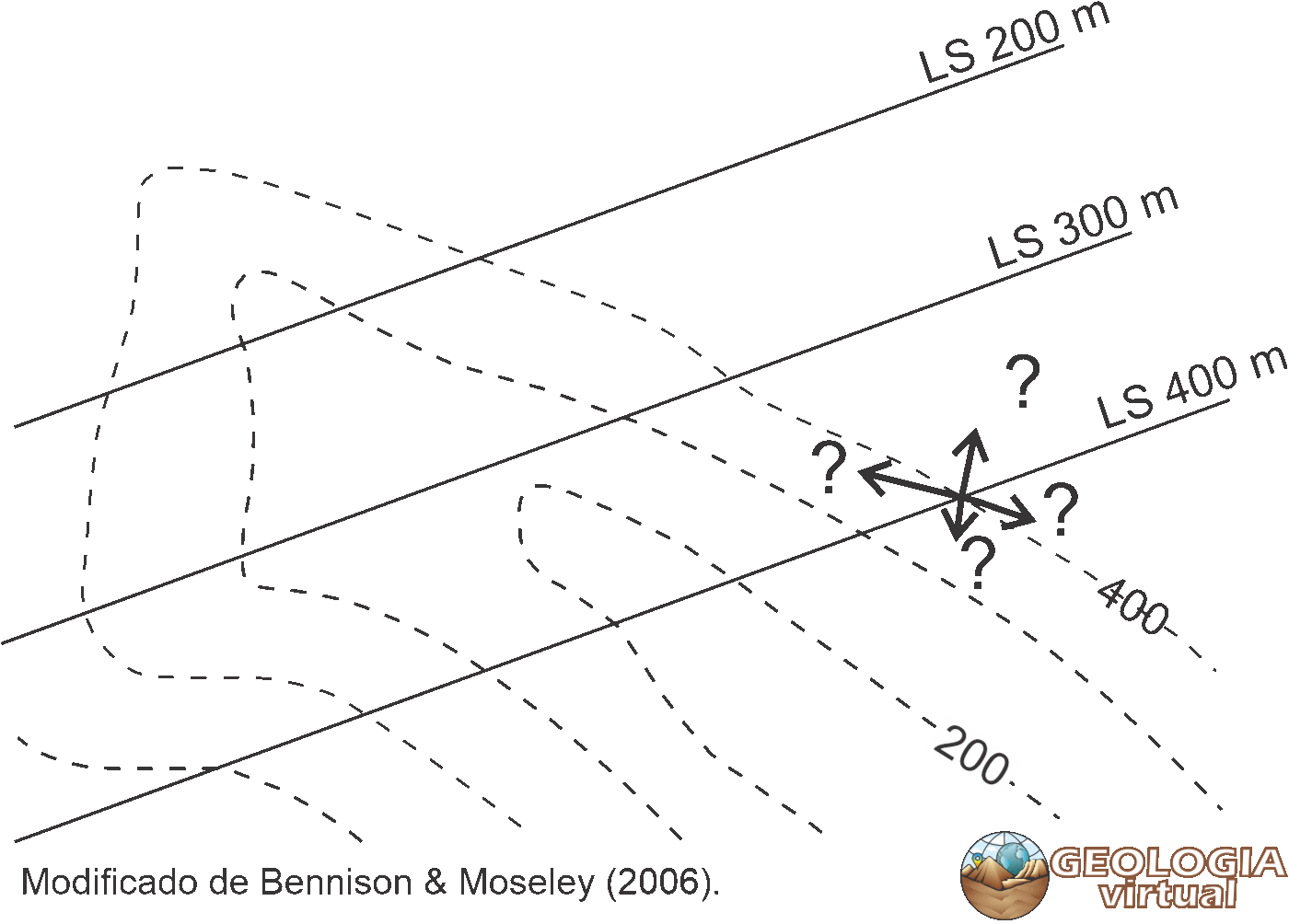 Ao desenhar o contato geológico, fique atento ao ponto onde uma LS cruza uma linha topográfica com a mesma cota — esse é o ponto de afloramento. Partindo desse ponto, o traçado pode seguir apenas dois "caminhos": continuar na direção onde os valores da LS e da linha topográfica (cota) aumentam ou seguir na direção onde ambos diminuem.