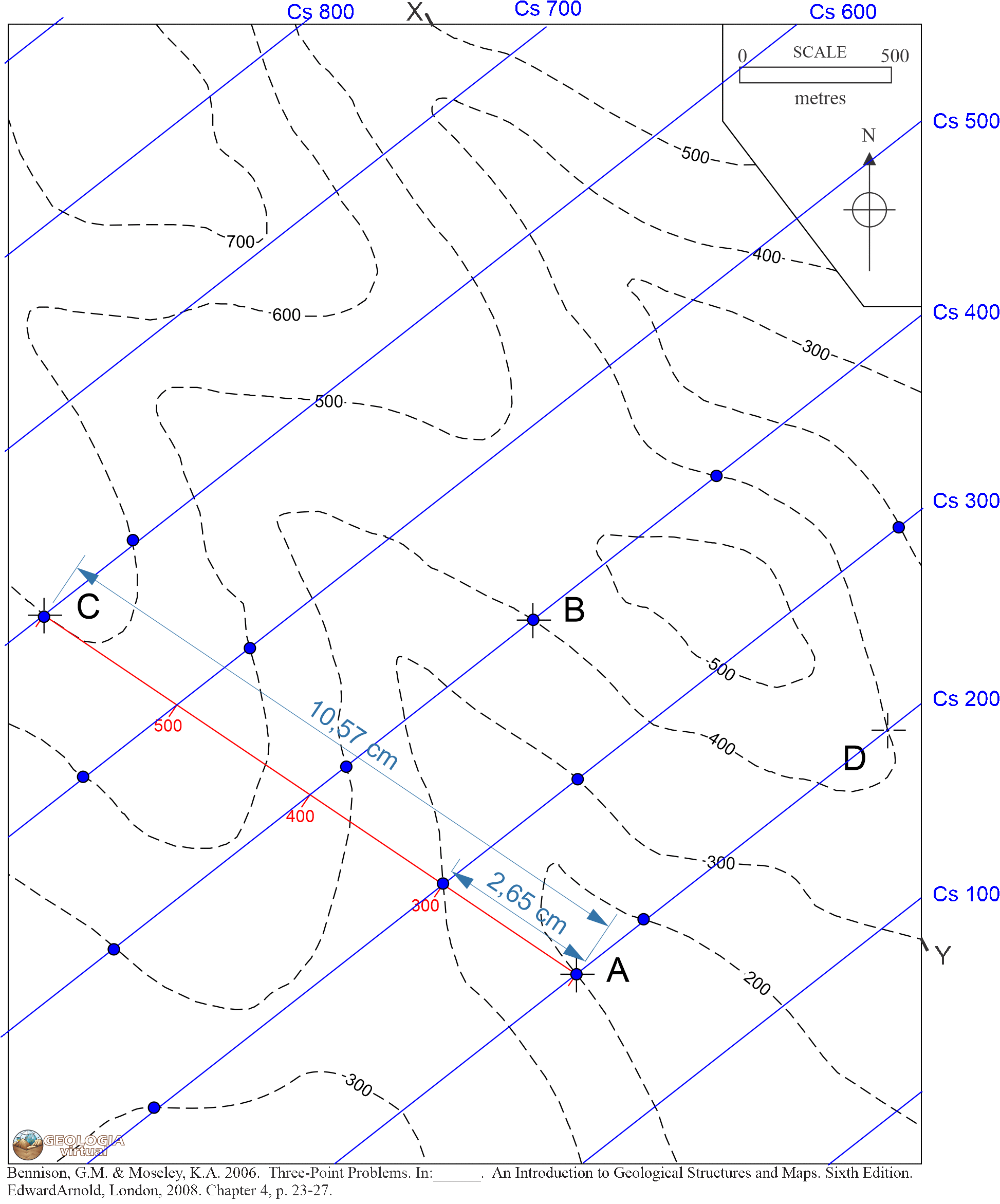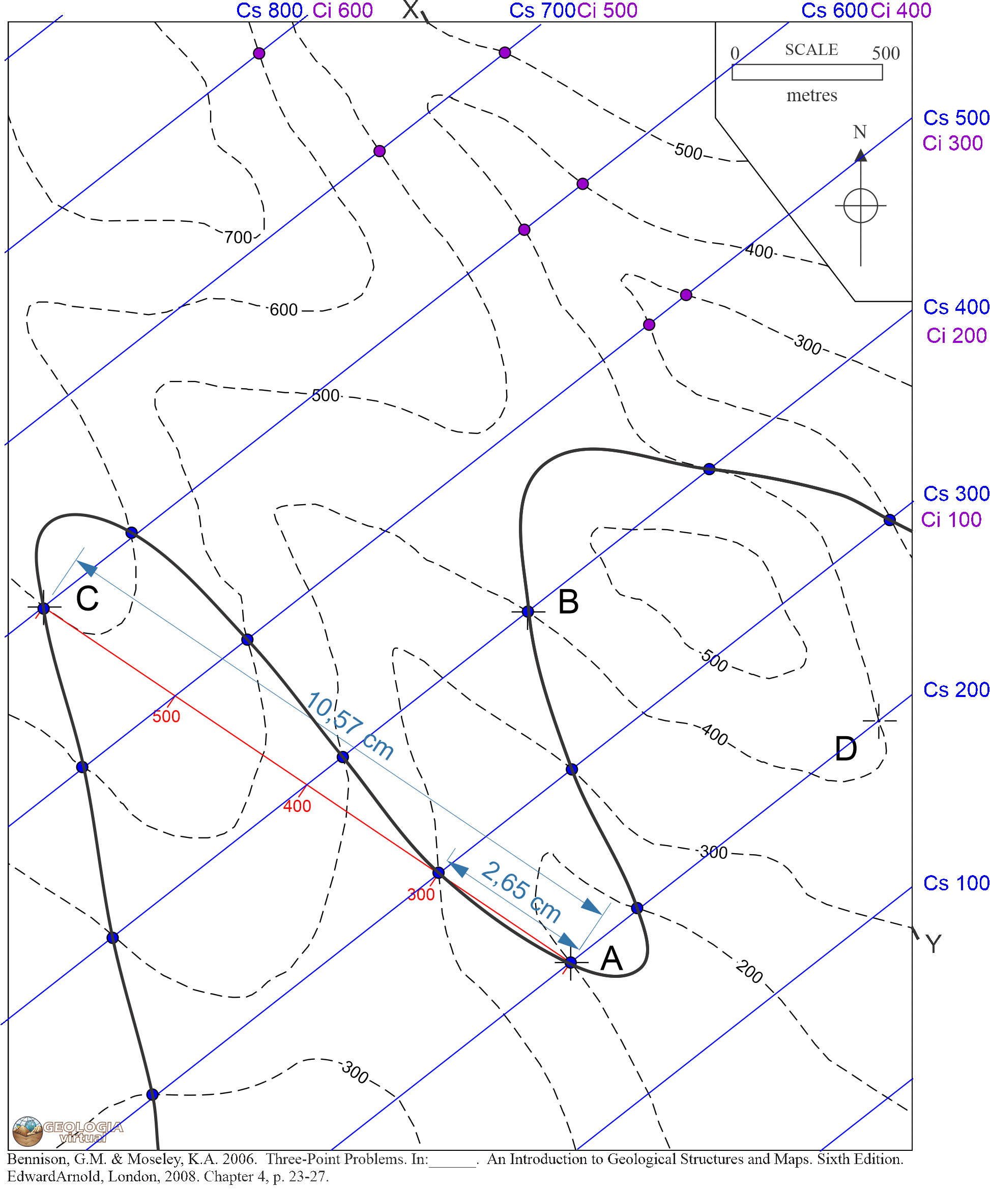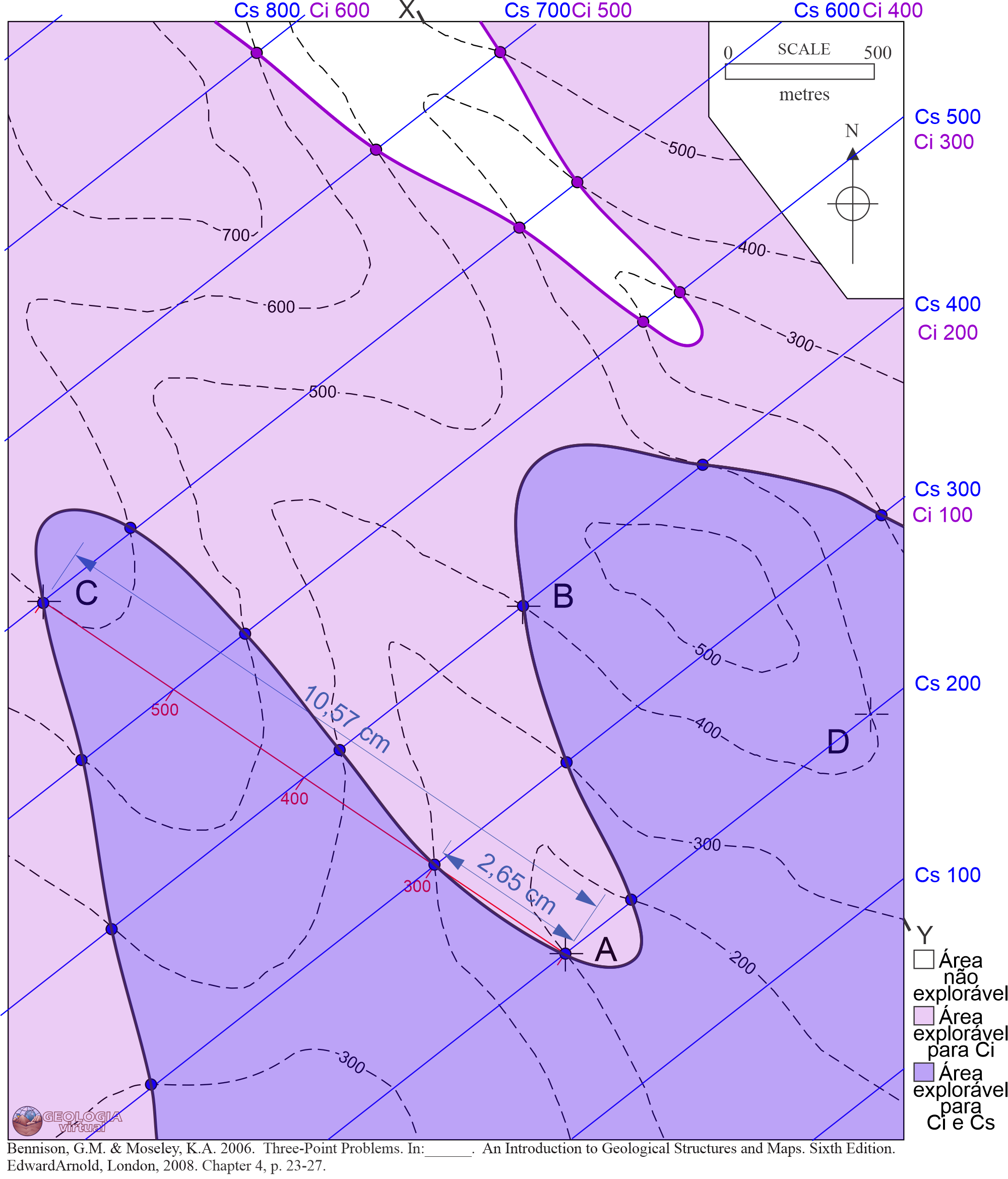 A camada inferior (Ci) está 200 m abaixo da camada superior (Cs). Assim, podemos aproveitar as Linhas de Strike já traçadas para Cs, apenas reduzindo a cota em 200 m para cada linha de Ci.