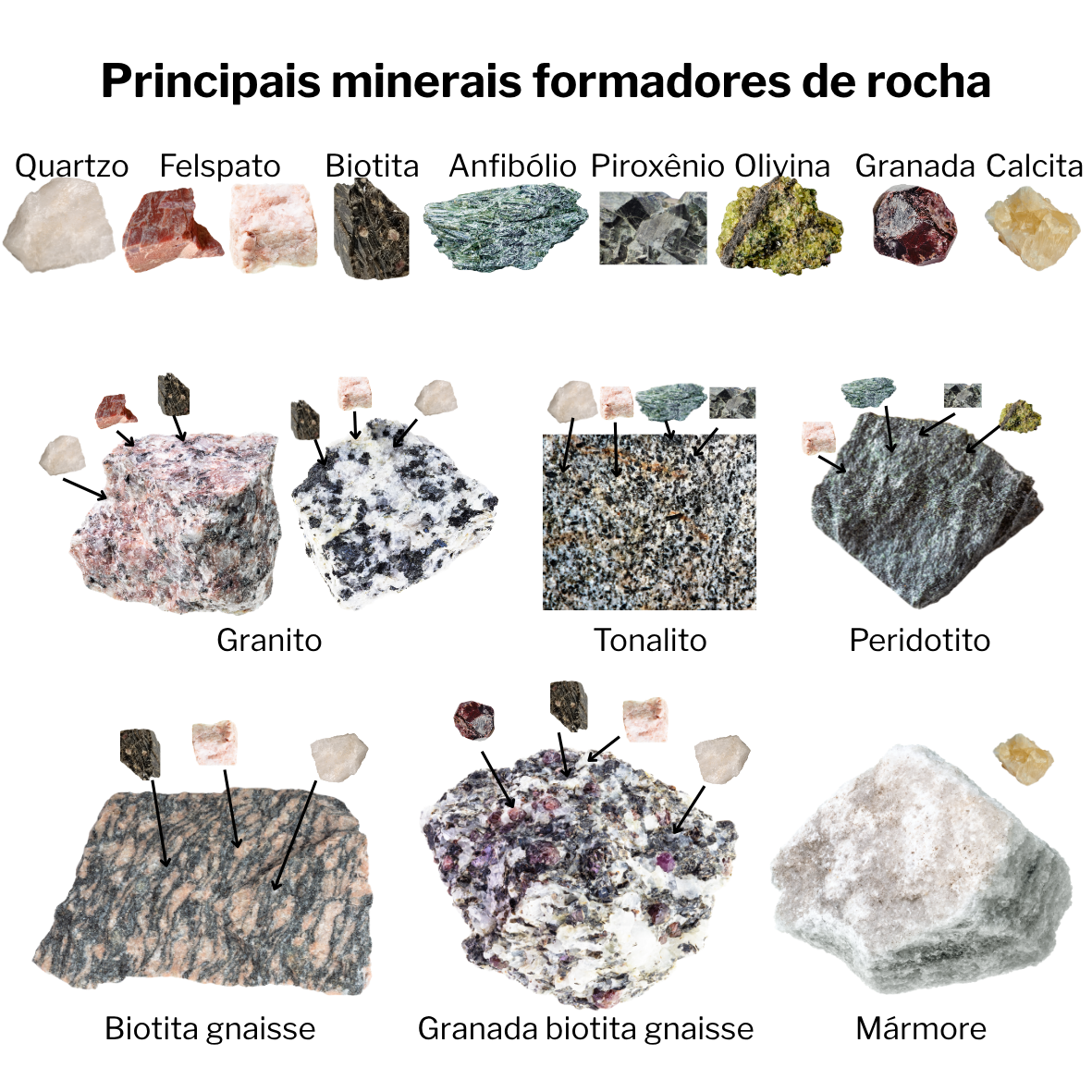 Figura 9: Principais minerais formadores de rocha e sua associação com diferentes tipos de rochas: quartzo, feldspato, biotita, anfibólio, piroxênio, olivina, granada e calcita, ilustrados em rochas como granito, tonalito, peridotito, gnaisse e mármore. Fonte: Canva Pro. Acesso em: 9 abr. 2026.
