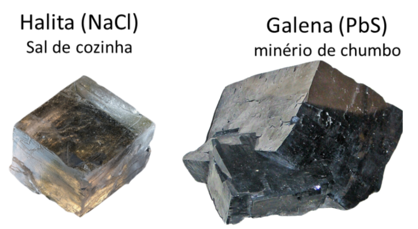 Alguns minerais podem variar levemente na composição química sem alterar sua estrutura, formando séries minerais. Halita e galena, por exemplo, possuem a mesma estrutura cristalina cúbica, apesar de terem composições químicas diferentes (Figura 4).