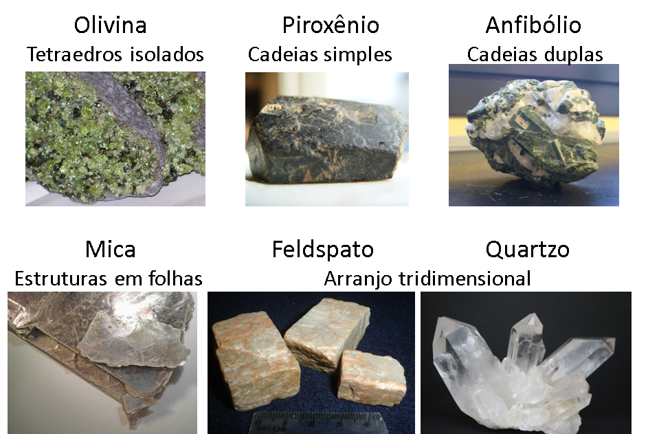 Figura 5: Subgrupos de silicatos e arranjos do tetraedro SiO₄. Fontes: Wikimedia Commons, Flickr (Banco de Imagens Geológicas) e PxHere. Licença: CC BY-SA 3.0. Acesso em: 2 abr. 2026.