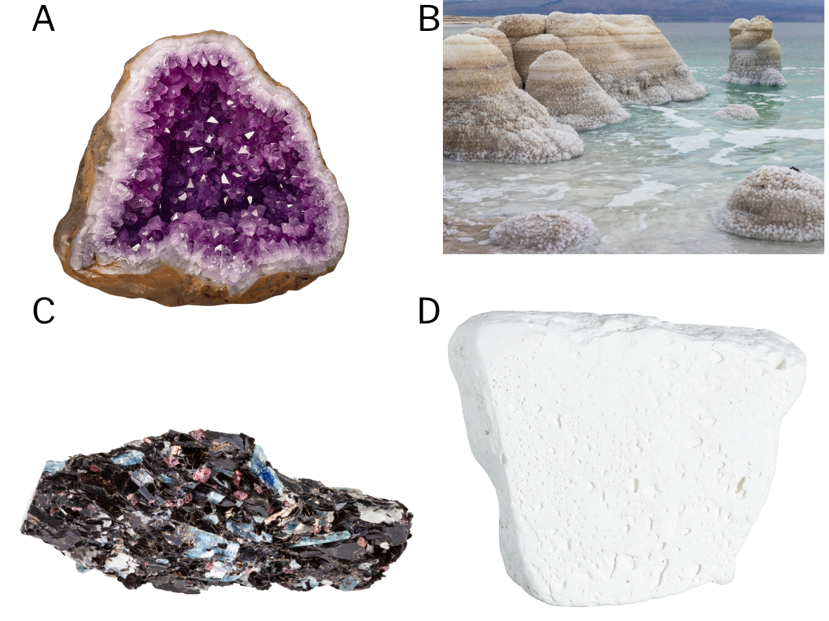 Figura 2: Exemplos de formação de minerais por diferentes processos geológicos: (A) geodo com cristais formados por cristalização; (B) formações salinas no Mar Morto, resultantes de precipitação química; (C) gnaisse com sillimanita formada por metamorfismo; (D) caulinita, produto de intemperismo. Fonte: Canva Pro. Acesso em: 8 abr. 2026.