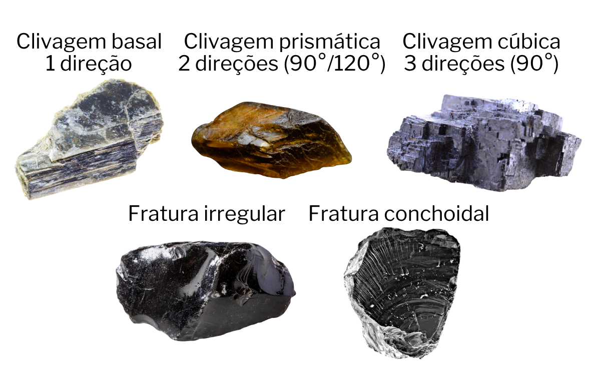 Figura 8 : Tipos de clivagem dos minerais: clivagem basal (1 direção), clivagem prismática (2 direções, ~60°/120°), clivagem cúbica (3 direções, 90°), além de fratura irregular e fratura conchoidal. Fonte: Canva Pro. Acesso em: 9 abr. 2026.