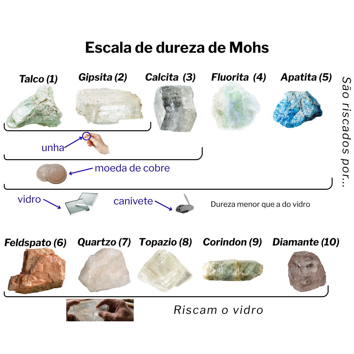 Figura 7: Escala de dureza de Mohs, mostrando minerais organizados do mais macio ao mais duro (1 a 10) e objetos de referência do cotidiano (unha, moeda de cobre, vidro e canivete) utilizados para testes de risco.