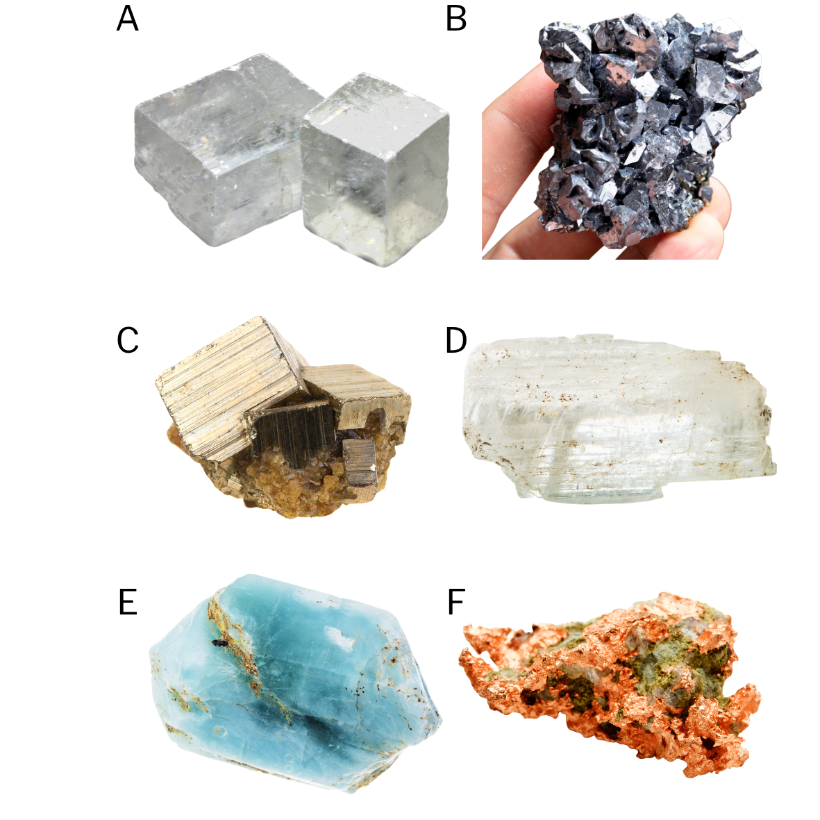 Figura 6: Exemplos de classes de minerais: (A) carbonato — calcita; (B) óxido — hematita (Fe₂O₃), importante minério de ferro; (C) Sulfeto — pirita (FeS2); (D) sulfato — gipsita (CaSO₄·2H₂O), utilizada na produção de gesso; (E) fosfato — apatita [Ca₅(PO₄)₃(F,Cl,OH)], principal fonte de fósforo; (F) elemento nativo — cobre (Cu). Fonte: Canva Pro. Acesso em: 8 abr. 2026.