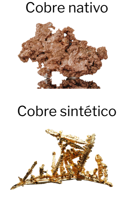 Figura 1: Comparação entre cobre nativo, formado por processos naturais, e cobre sintético, produzido artificialmente em laboratório. Fontes: Wikimedia Commons e Canva Pro. Acesso em: 2 abr. 2026.
