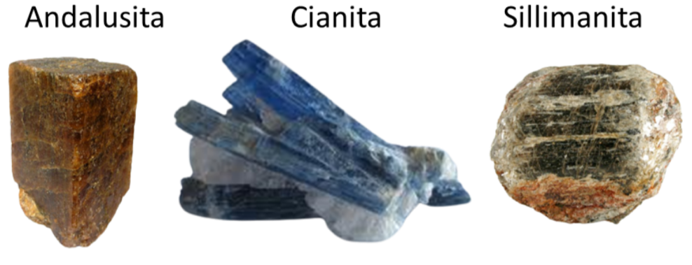 Figura 3: Polimorfismo: minerais com a mesma composição química (Al₂SiO₅), mas diferentes estruturas cristalinas devido às condições de temperatura e pressão (andalusita, sillimanita e cianita). Fontes: Wikimedia Commons. Licença: CC BY-SA 3.0. Acesso em: 2 abr. 2026.